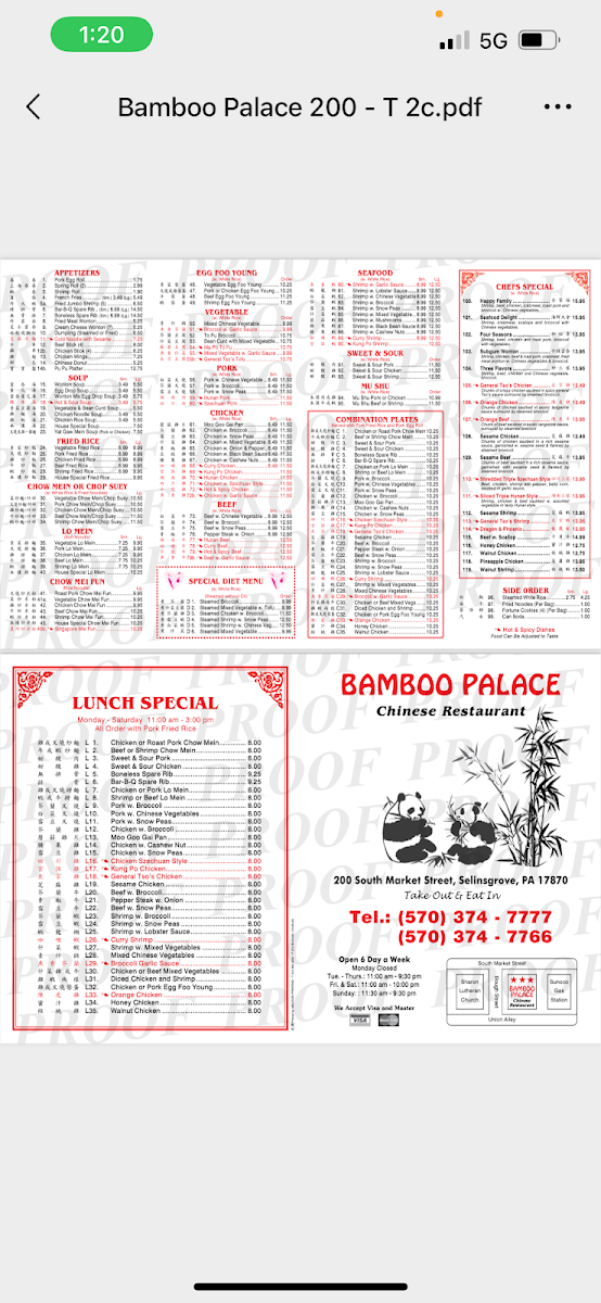 Welcome to Bamboo Palace Restaurant, a delightful culinary oasis located in Selinsgrove, PA. Specializing in authentic Chinese cuisine, this gem is a takeout haven where flavors come alive. The menu is a vibrant tapestry of dishes, with standout options like the Pork with Chinese Veg and the Hunan Pork, each priced at a reasonable US$15.60. For those seeking lighter fare, the Special Diet Menu offers a selection of wholesome steamed dishes catering to diverse dietary preferences.